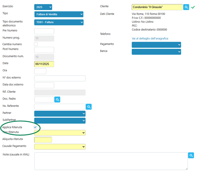 2. Spunta il flag “Applica Ritenuta”. Appariranno così i campi per indicare i dati della ritenuta