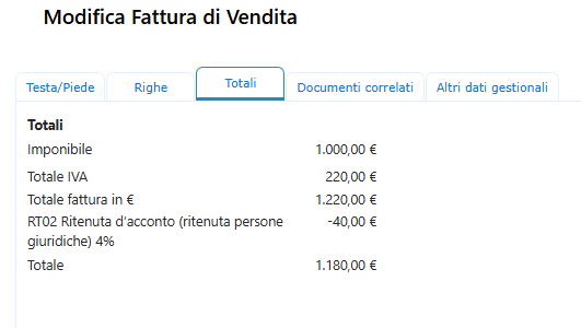 6. Una volta inserite le varie righe della fattura, vai nella tab relativa ai totali e noterai che verrà calcolata la ritenuta desiderata.