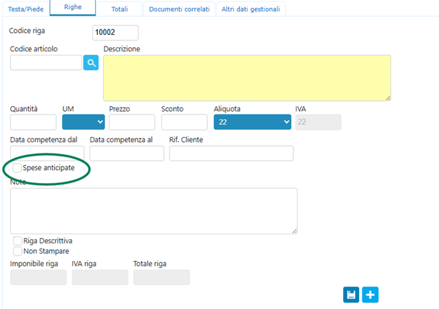 5.Se per qualche riga non vuoi che venga applicata la ritenuta d’acconto, devi spuntare il flag “Spese anticipate” presente nel dettaglio riga.